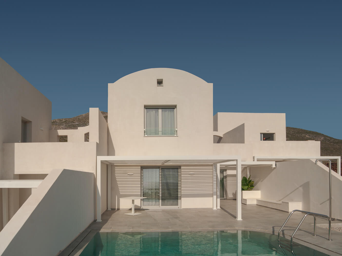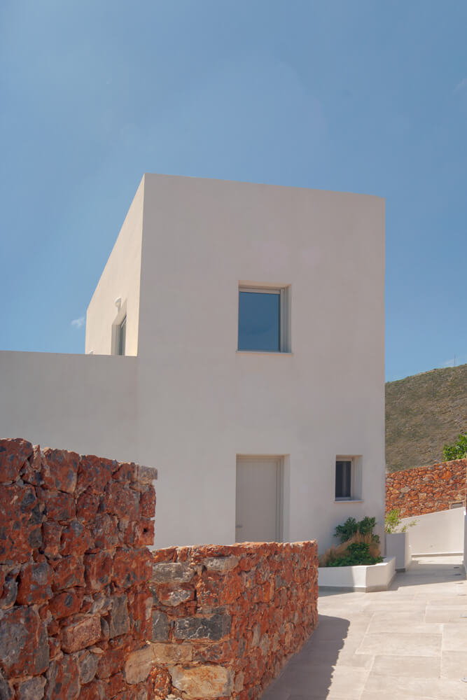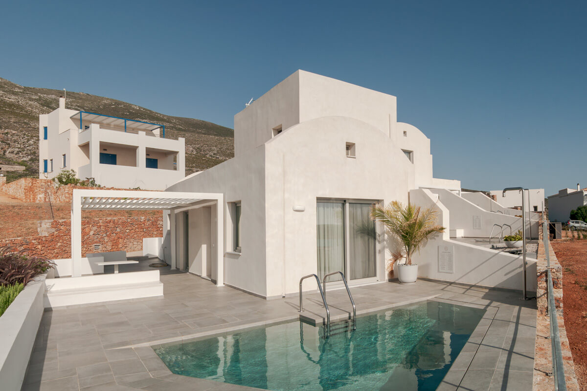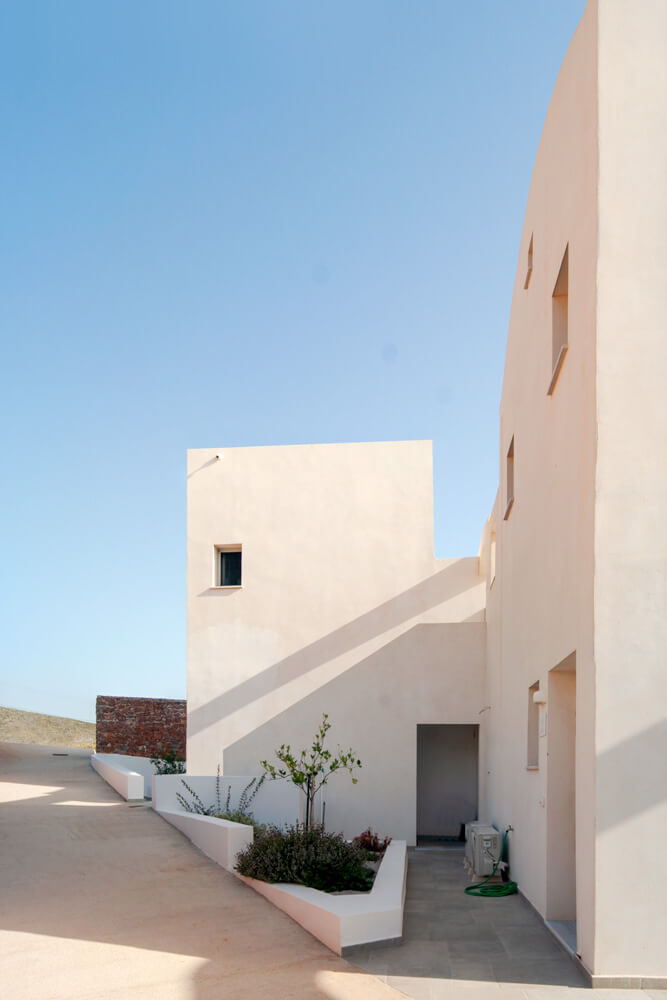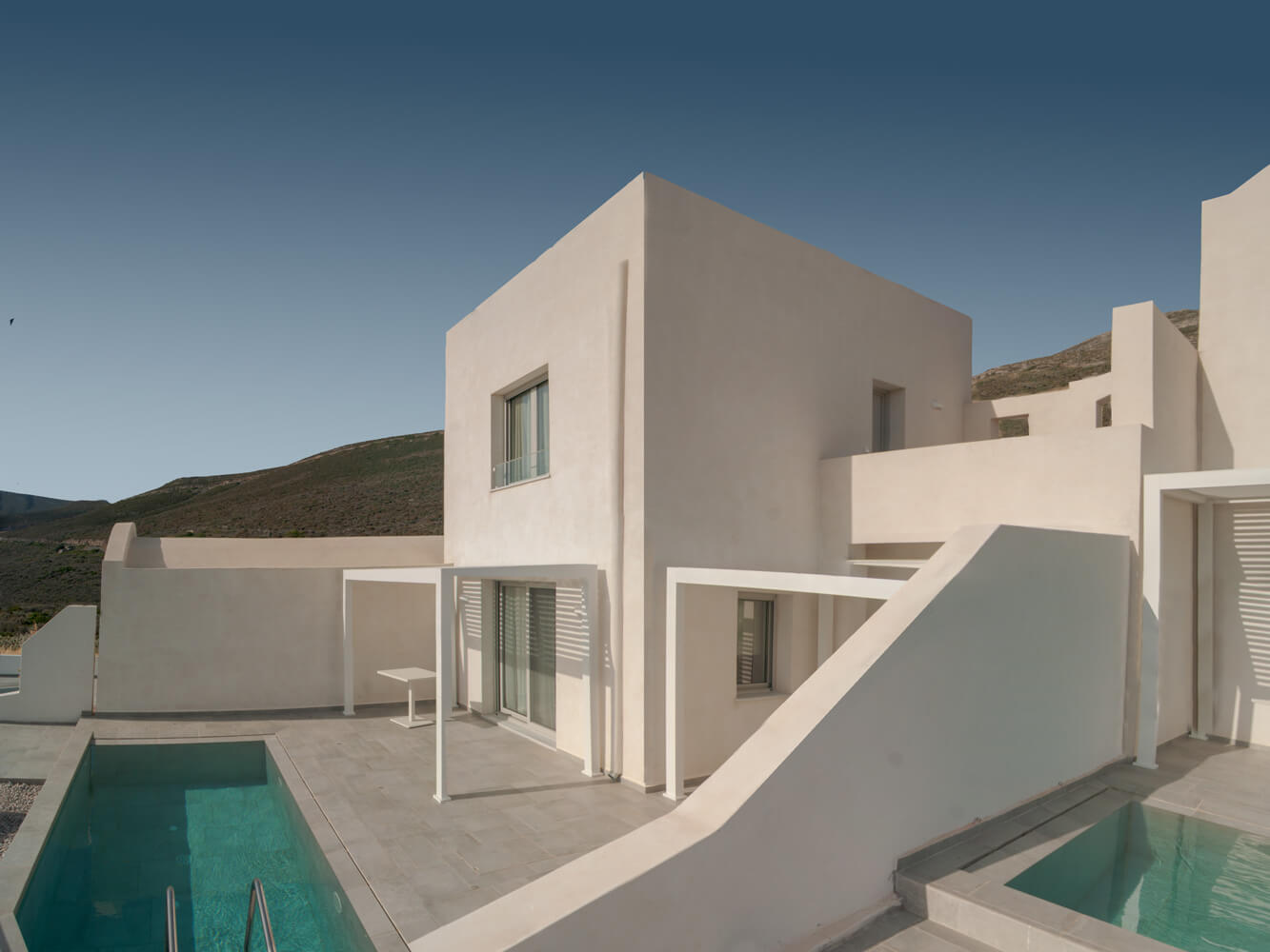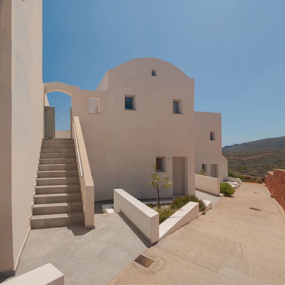 The complex consists of ground-floor and two-storey small buildings, which are divided into six apartments and a reception. The shape of the buildings originates from the traditional typological elements of the island's architecture, revisited according to modern use requirements. The houses have been positioned in the plot having in mind the privacy of their outdoor spaces and the unobstructed view towards the sea, the small island and the shipwreck. The ground floor apartments have a private pool, while the first floor smaller apartments have a large terrace that serves as an open lounge overlooking the sea. The pergolas allow comfortable use of the outdoor areas all year round.