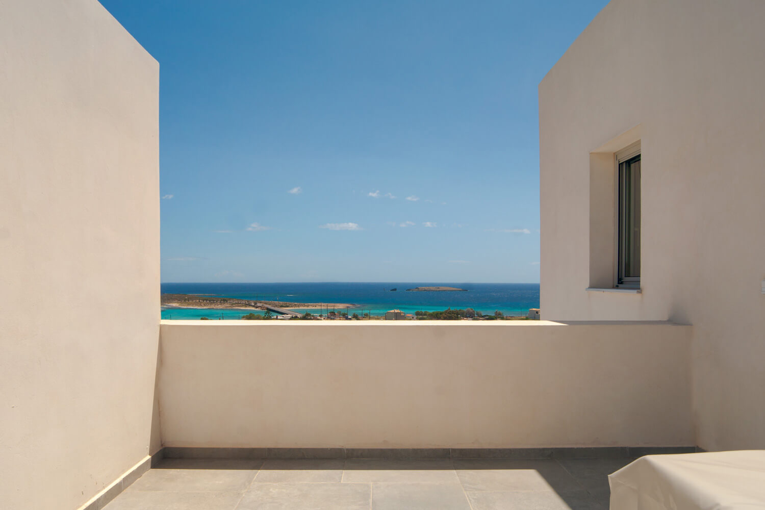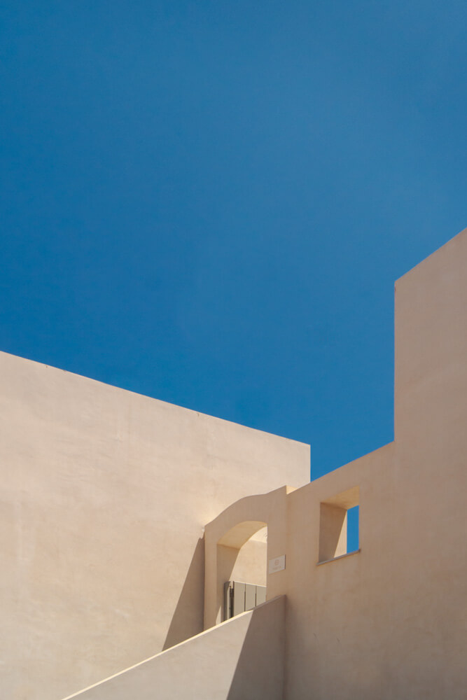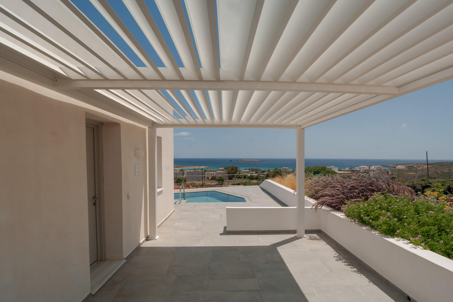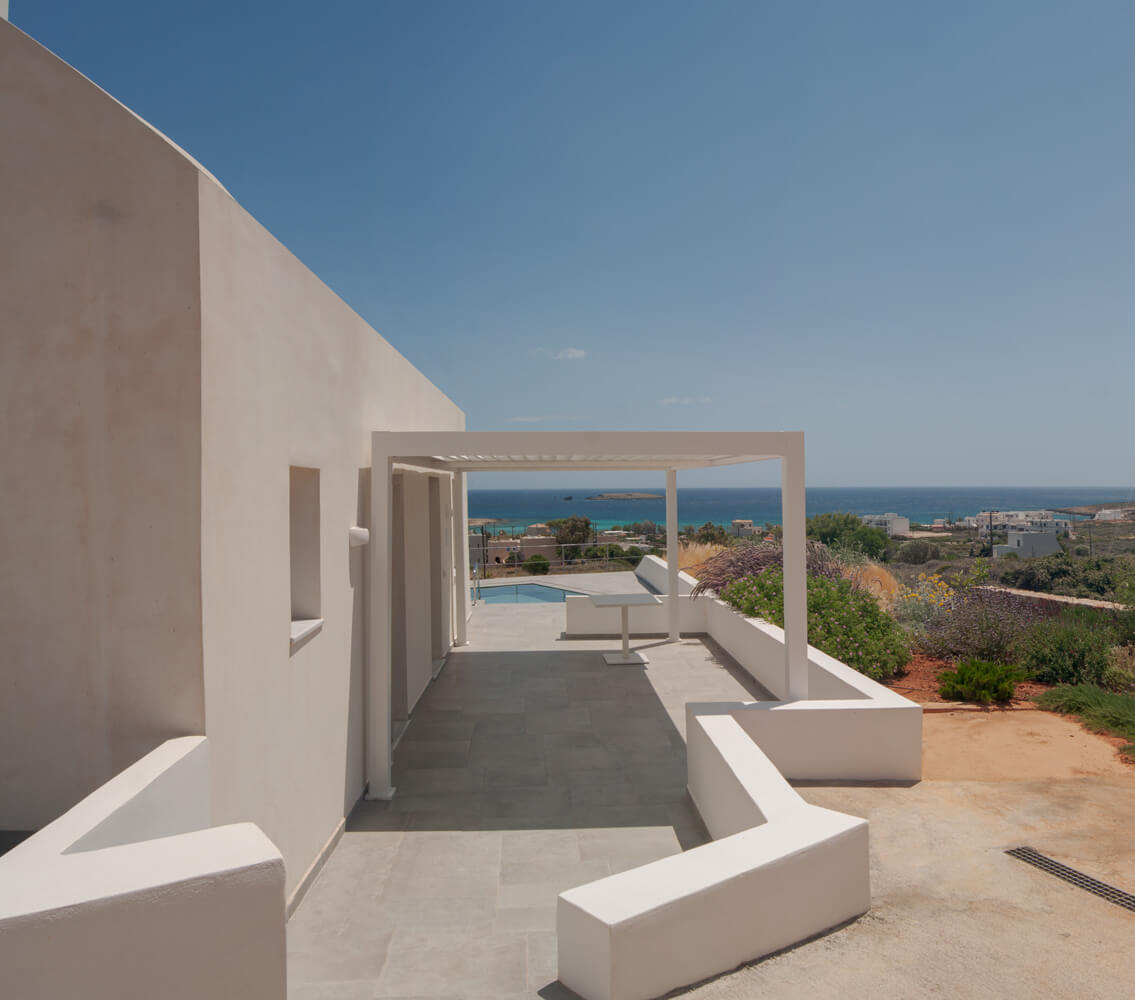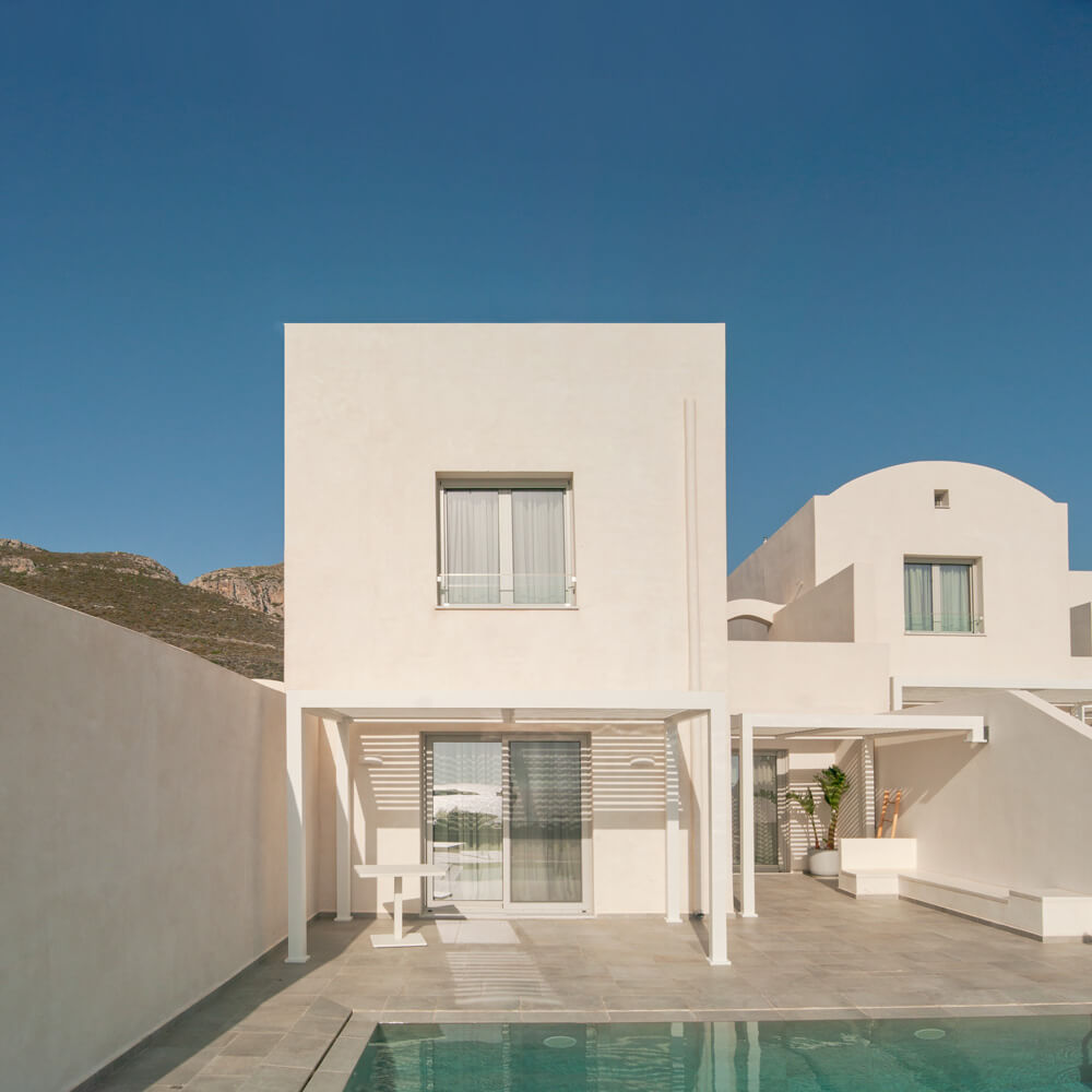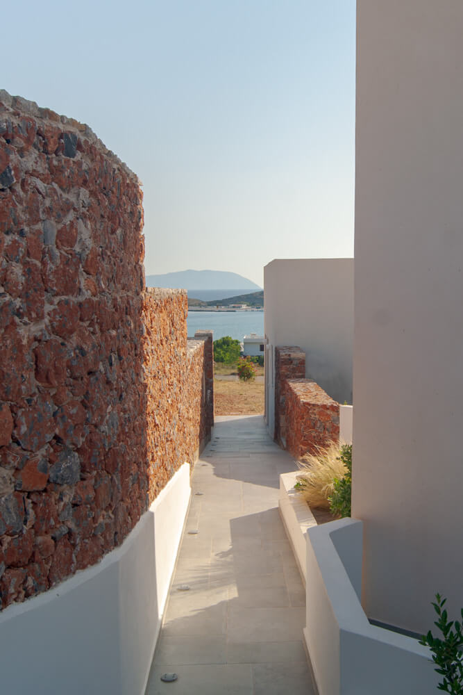 The complex consists of ground-floor and two-storey small buildings, which are divided into six apartments and a reception. The shape of the buildings originates from the traditional typological elements of the island's architecture, revisited according to modern use requirements. The houses have been positioned in the plot having in mind the privacy of their outdoor spaces and the unobstructed view towards the sea, the small island and the shipwreck. The ground floor apartments have a private pool, while the first floor smaller apartments have a large terrace that serves as an open lounge overlooking the sea. The pergolas allow comfortable use of the outdoor areas all year round.