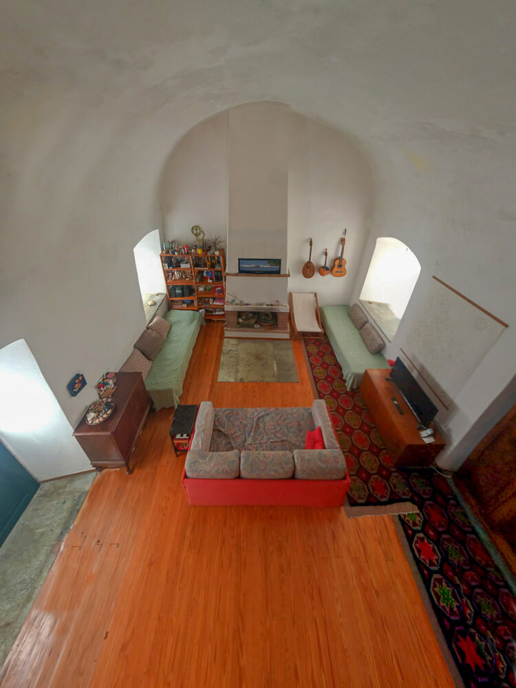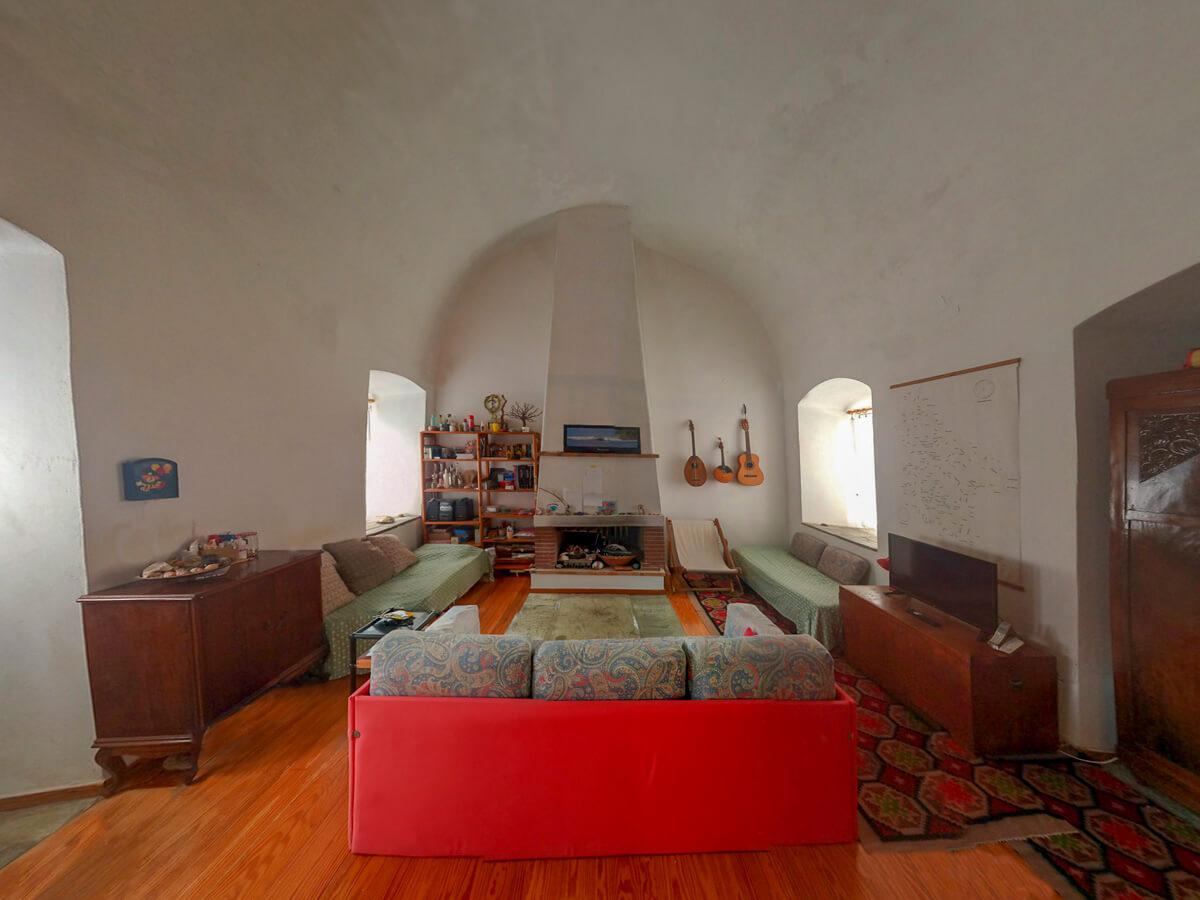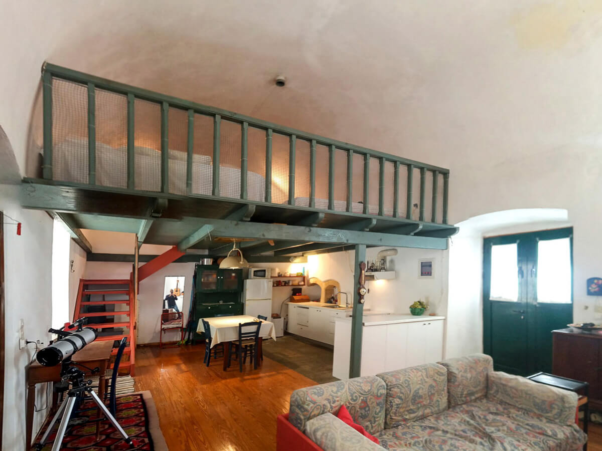 The building - dating back to the end of the 19th century - is covered by a large barrel vault and is part of a group of two buildings that share a common garden and an underground cistern. TThe bedroom is located on the new wooden loft, while – in order not to break up the unified interior space – the bathrooms and the storage room are housed in the old auxiliary buildings cluster. The masonry gutter has been restored and supplies the underground cistern with rainwater.